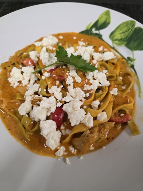mit Gyrosfleisch, Feta-Käse, frischem Paprika in Tomaten-Sahnesoße